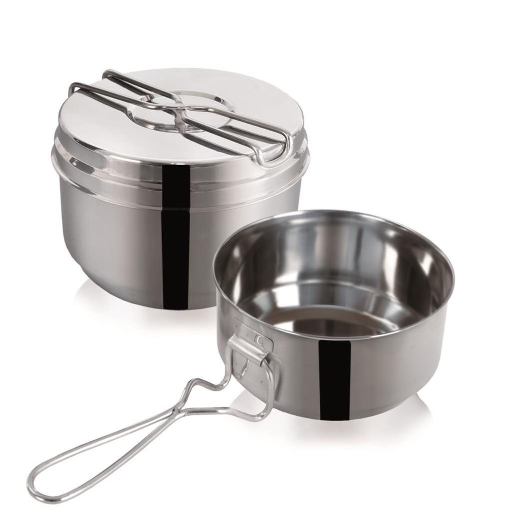 3-part camping dining set - you can use it for children's camps, camping, camping,.... The set consists of a large and a small casserole with a handle and a lid of the large casserole, which you can also use as a bowl. Material: stainless steel. Suitable for serving, not for heating food! Dimensions: w. 15 cm, h. 9 cm, volume 1,5 l, w. 13 cm, h. 7,5 cm, volume 0,9 l.