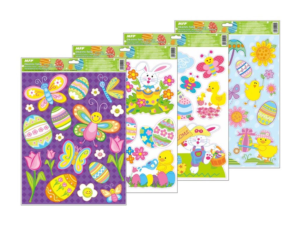 Okenní fólie - velikonoční kuřátka, vajíčka, motýlci, zajíčci - Vyzdobte si okno těmito krásnými samolepkami na okno. Vytvoří Vám kouzelnou atmosféru domova. NÁVOD: Sloupněte obrázek z podložky a umístěte na čisté, případně navlhčené sklo stranou, která byla na podložce. Obrázek elektrostaticky přilne. Folie se snadno sloupne a dá se přemístit. Cena za 1 ks, dodáváme v mixu po 4 ks dle skladové zásoby.