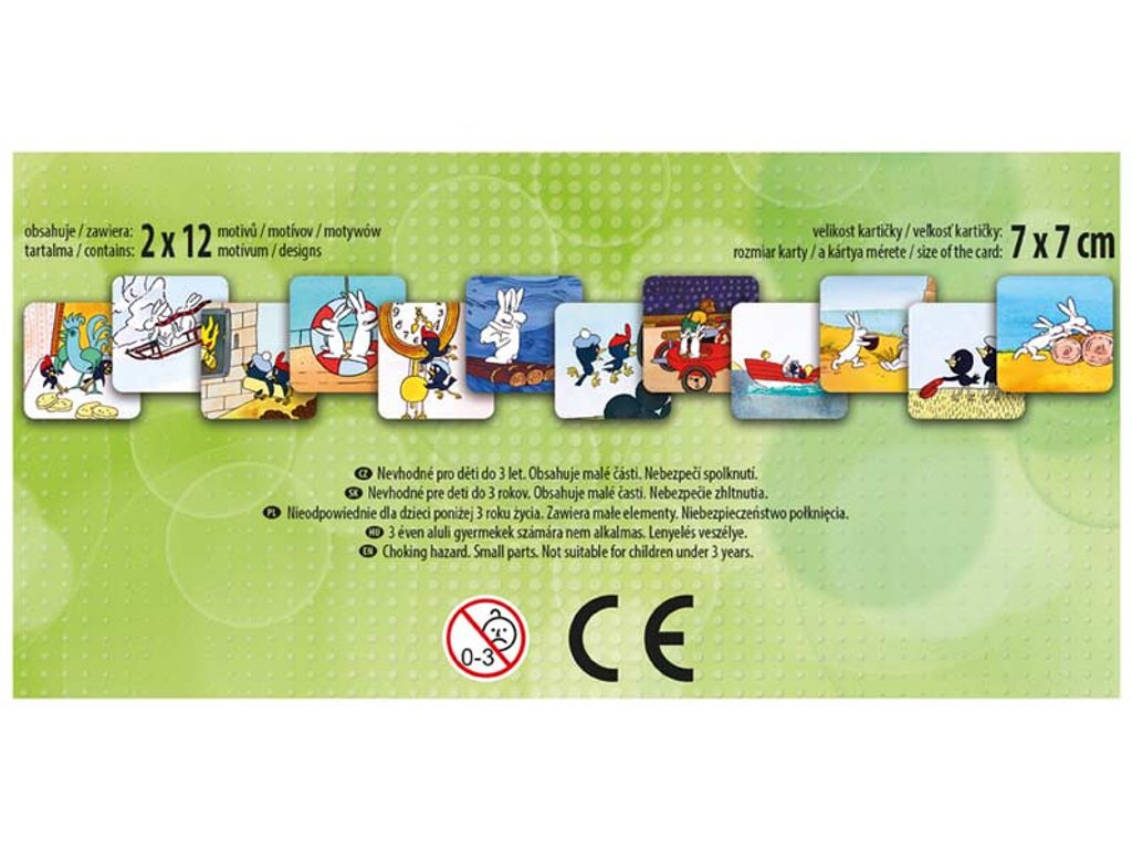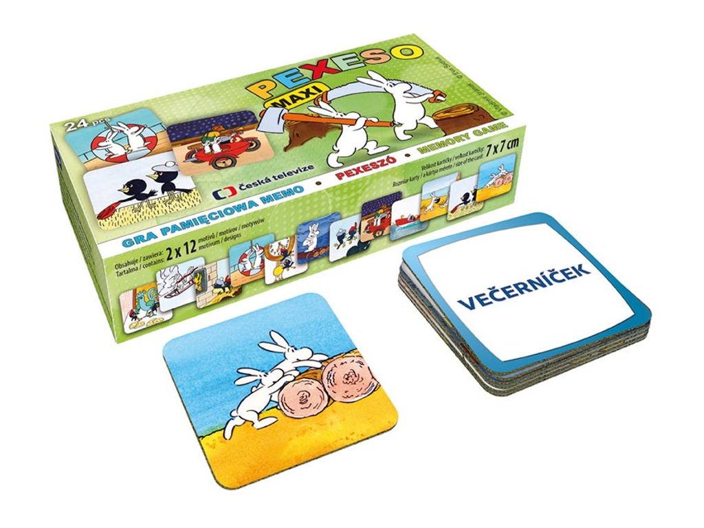 PEXESO je populární dětská stolní hra, která nikdy neomrzí a zapojit se můžou i dospělí. Pexeso - Bob a Bobek + Kosí bratři - nás zavede zpět do pohádkového světa ČT. Věděli jste, že slovo PEXESO vzniklo souslovím slov PEKELNĚ SE SOUSTŘEĎ? Výborná učební pomůcka pro děti a rodiče. Naučte své děti poznávat oblíbené české večerníčky a procvičujte jejich paměť. Tato hra je zabaví na dlouhé hodiny. Pexeso se skládá z 2x12 vyseklých kartiček pexesa. Tloušťka kartonu je 3 mm, aby jej malé děti mohly lépe uchopit a otočit. VELIKOST HRACÍCH KARET: 7 x 7 cm NÁVOD KE HŘE PEXESO: Pexeso mohou hrát nejméně dva hráči. Všechny kartičky zamíchají a rozloží obrázkem dolů. Nesmí se při tom dívat na obrázek. Hráči si určí pořadí hry. Hráč otočí dvě libovolné kartičky tak, aby si i ostatní spoluhráči mohli obrázky a jejich umístění zapamatovat. Pokud nemají kartičky stejné obrázky, otočí je a vrátí na původní místo. Pokračuje další hráč, který je na řadě. Jestliže objeví stejné obrázky, získává bod a obě kartičky vyřadí ze hry. Pokračuje do té chvíle, kdy otočí dva různé obrázky. Vyhrává hráč, který získá více bodů. VAROVÁNÍ: Nevhodné pro děti do 3 let. Nebezpečí vdechnutí a spolknutí malých částic. Uvedená cena je za 1 ks.